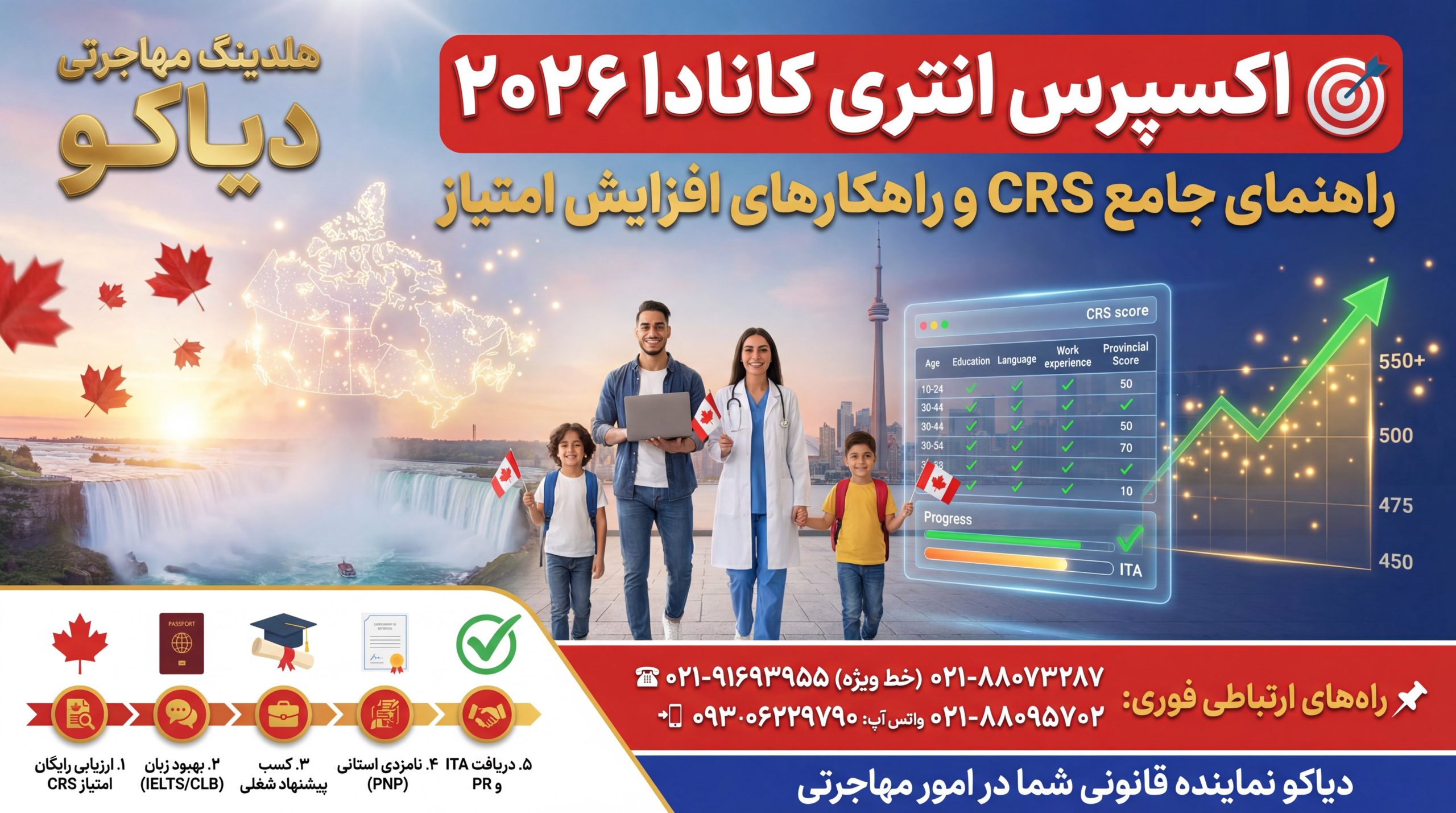 این مقاله توسط تیم متخصص مشاورین و وکلای هلدینگ مهاجرتی دیاکو تهیه شده است تا با اطمینان کامل مسیر اکسپرس انتری و افزایش امتیاز CRS را طی کنید. تیم دیاکو با سالها تجربه موفق در زمینه اکسپرس انتری، آماده ارائه خدمات حرفهای از محاسبه دقیق امتیاز CRS، ارزیابی پروفایل، استراتژی افزایش امتیاز تا دریافت ITA و اقامت دائم به شما است. برای مشاوره رایگان، محاسبه امتیاز CRS و تهیه استراتژی شخصیسازیشده، همین امروز با کارشناسان ما تماس بگیرید.