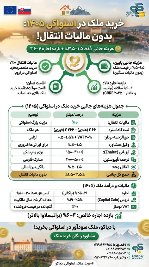 | مالیات انتقال | ۰% | مزیت بزرگ اسلواکی |