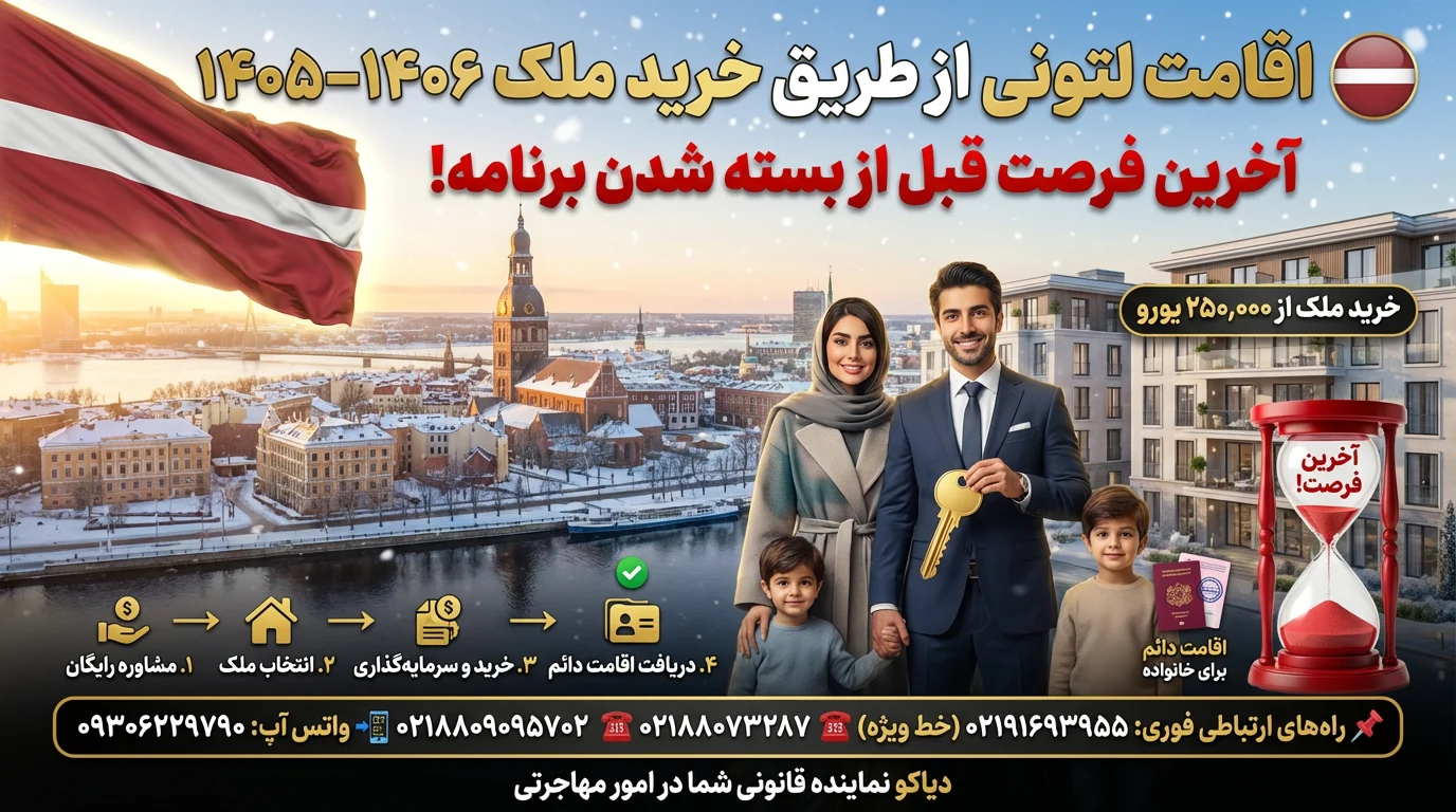 صفحه اصلی ثبت شرکت🇱🇻 اقامت لتونی از طریق خرید ملک ۱۴۰۵–۱۴۰۶ | آخرین فرصت قبل از بسته شدن برنامه! 🇱🇻 اقامت لتونی از طریق خرید ملک ۱۴۰۵–۱۴۰۶ | آخرین فرصت قبل از بسته شدن برنامه! توسط مشاور ارشد مهاجرتی دیاکو ارسال شده: آگوست 13, 2025 توسط مشاور ارشد مهاجرتی دیاکو ارسال شده: آگوست 13, 2025 0 نظرات 3 دقایقی بخوانید Share FacebookTwitterPinterestLinkedinWhatsappTelegramCopy LinkSkypeEmail Bookmark به اشتراک بگذارید 0FacebookTwitterPinterestLinkedinWhatsappTelegramCopy LinkSkypeEmail 1 Table of Contents هشدار مهم: برنامه خرید ملک احتمالاً تا پایان ۲۰۲۵ بسته میشود!شرایط فعلی خرید ملک برای اقامت لتونی (تا پایان ۲۰۲۵)هزینههای دقیق خرید ملک در لتونی + اقامت (بهروزرسانی دسامبر ۲۰۲۵)قیمت ملک در شهرهای مهم لتونی (دسامبر ۲۰۲۵)مراحل دقیق و سریع (۳ تا ۶ ماه)چرا همین امروز باید اقدام کنید؟جایگزینهای ۲۰۲۶ (بعد از حذف برنامه ملک)زندگی در لتونی چقدر هزینه دارد؟ (ماهانه – ریگا)کیسهای موفق ایرانیان در ۱۴۰۴سوالات پرتکرارهمین امروز اقدام کنید! آخرین بهروزرسانی: ۳ دسامبر ۲۰۲۵تأییدشده توسط وکیل رسمی مهاجرت در ریگا (ثبتشده در OCMA لتونی) هشدار مهم: برنامه خرید ملک احتمالاً تا پایان ۲۰۲۵ بسته میشود! دولت لتونی در نوامبر ۲۰۲۵ رسماً اعلام کرد که از سال ۲۰۲۶ دیگر با خرید ملک اقامت نمیدهد.فقط حدود ۳۸۰ سهمیه تا پایان سال باقی مانده است.اگر قصد دارید با این روش اقامت شینگن بگیرید، همین امروز اقدام کنید. اقامت لتونی از طریق خرید ملک شرایط فعلی خرید ملک برای اقامت لتونی (تا پایان ۲۰۲۵) شرطمقدار فعلی (۲۰۲۵)توضیحات مهمحداقل ارزش ملک۲۵۰٬۰۰۰ یورویک ملک یا مجموع چند ملکهزینه دولتی (غیرقابل بازگشت)۵٪ ارزش کاداسترحدود ۱۲٬۵۰۰–۱۵٬۰۰۰ یوروارزش کاداستر حداقل۸۰٬۰۰۰ یوروالزامینوع ملک مجازمسکونی یا تجاریزمین کشاورزی/جنگلی ممنوعریگا و یورمالافقط یک ملک بالای ۲۵۰٬۰۰۰ یورو–سایر شهرهامجموع دو ملک بالای ۲۵۰٬۰۰۰ یورو–مدت اقامت اولیه۵ سال (قابل تمدید)الحاق همسر و فرزندان زیر ۱۸ سالسفر شینگنآزاد در تمام کشورهای شینگنبدون ویزا هزینههای دقیق خرید ملک در لتونی + اقامت (بهروزرسانی دسامبر ۲۰۲۵) ردیفمورد هزینهمبلغ تقریبی (یورو)توضیح1حداقل قیمت ملک۲۵۰٬۰۰۰ریگا مرکز: ۳۵۰٬۰۰۰+2هزینه دولتی ۵٪۱۲٬۵۰۰ – ۱۵٬۰۰۰غیرقابل بازگشت3وکیل + نوتار + حساب امانی۲٬۵۰۰ – ۴٬۰۰۰برای ایرانیها ضروری4ترجمه رسمی + آپوستیل۶۰۰ – ۱٬۲۰۰تمام مدارک5ویزای D + انگشتنگاری۱۵۰ – ۳۰۰ هر نفرخانواده ۴ نفره ≈ ۱٬۰۰۰6بیمه درمانی سالانه۸۰۰ – ۱٬۵۰۰پوشش کامل شینگن7سایر (عکس، پست، حملونقل)۳۰۰ – ۵۰۰–جمع هزینه اولیه (بدون ملک)۱۸٬۸۵۰ – ۲۶٬۰۰۰ یوروفقط هزینههای جانبی قیمت ملک در شهرهای مهم لتونی (دسامبر ۲۰۲۵) شهر / منطقهقیمت هر مترمربع (یورو)آپارتمان ۸۰ متری (یورو)بازده اجاره سالانهریگا – مرکز قدیم۴٬۵۰۰ – ۸٬۰۰۰۳۶۰٬۰۰۰ – ۶۴۰٬۰۰۰۴.۲ – ۵.۱٪ریگا – تیهکا / آگنسکالنس۳٬۲۰۰ – ۴٬۸۰۰۲۵۶٬۰۰۰ – ۳۸۴٬۰۰۰۴.۸ – ۵.۸٪یورمالا (ساحلی)۴٬۰۰۰ – ۷٬۵۰۰۳۲۰٬۰۰۰ – ۶۰۰٬۰۰۰۴.۵ – ۶٪ (فصلی)لیپایا / داگاوپیلس۱٬۲۰۰ – ۲٬۲۰۰۹۶٬۰۰۰ – ۱۷۶٬۰۰۰۶ – ۷.۵٪ مراحل دقیق و سریع (۳ تا ۶ ماه) انتخاب ملک + رزرو (بیعانه ۵–۱۰٪) تنظیم قرارداد خرید + حساب امانی نوتاری پرداخت کامل + انتقال مالکیت در کاداستر ارسال مدارک به OCMA (اداره مهاجرت) دریافت ویزای D از سفارت لتونی در تهران ورود به لتونی + انگشتنگاری + دریافت کارت اقامت ۵ ساله ادامه مقاله 🇦🇹 ثبت شرکت در اتریش 2025قدرت گرفته از افزونه نوشتههای مرتبط هوشمندچرا همین امروز باید اقدام کنید؟ فقط ۳۸۰ سهمیه تا پایان ۲۰۲۵ باقی مانده از ۱ ژانویه ۲۰۲۶ این روش کاملاً حذف میشود قیمت ملک در ریگا تا پایان سال ۵–۷٪ رشد خواهد کرد جایگزینهای ۲۰۲۶ (شرکت + اوراق قرضه) حداقل ۷۵٬۰۰۰ یورو هزینه دارند و پیچیدهترند جایگزینهای ۲۰۲۶ (بعد از حذف برنامه ملک) خرید ملک در لتونی – شرایط و هزینه ها روش جدیدحداقل سرمایهزمان دریافت اقامتمزایاثبت شرکت + ایجاد ۳ شغل۵۰٬۰۰۰ € + حقوق۴–۸ ما