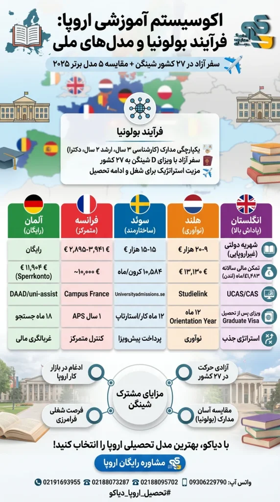 فرآیند بولونیا (Bologna Process) به یکپارچگی ساختار مدارک تحصیلی در اروپا (کارشناسی، کارشناسی ارشد، دکترا) کمک کرده و مقایسه مدارک را آسانتر نموده است.14 با این حال، تفاوتهای کلیدی در سیاستهای ویزا، بهویژه میان کشورهای عضو و غیرعضو شینگن، وجود دارد.14 یک دانشجوی بینالمللی که ویزای ملی بلندمدت (نوع D) از یک کشور شینگن (مانند آلمان یا فرانسه) دریافت میکند، میتواند بدون نیاز به ویزای اضافی، به ۲۶ کشور دیگر عضو شینگن سفر کند.14 این امر یک مزیت استراتژیک مهم برای دانشجویانی است که به دنبال فرصتهای حرفهای یا ادامه تحصیل در سراسر قاره اروپا پس از فارغالتحصیلی هستند. این آزادی حرکت، عملاً مرزهای جستجوی شغل دانشجو را از یک کشور به یک بلوک اقتصادی بزرگ گسترش میدهد، که یک عامل حیاتی برای متقاضیانی با اهداف شغلی بلندمدت است.