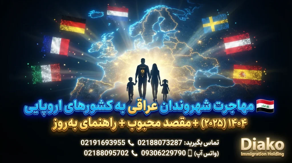 alt: مهاجرت شهروندان عراقی به کشورهای دیگر ۱۴۰۴ – مقاصد اروپا، آمریکا، کانادا – هلدینگ دیاکو